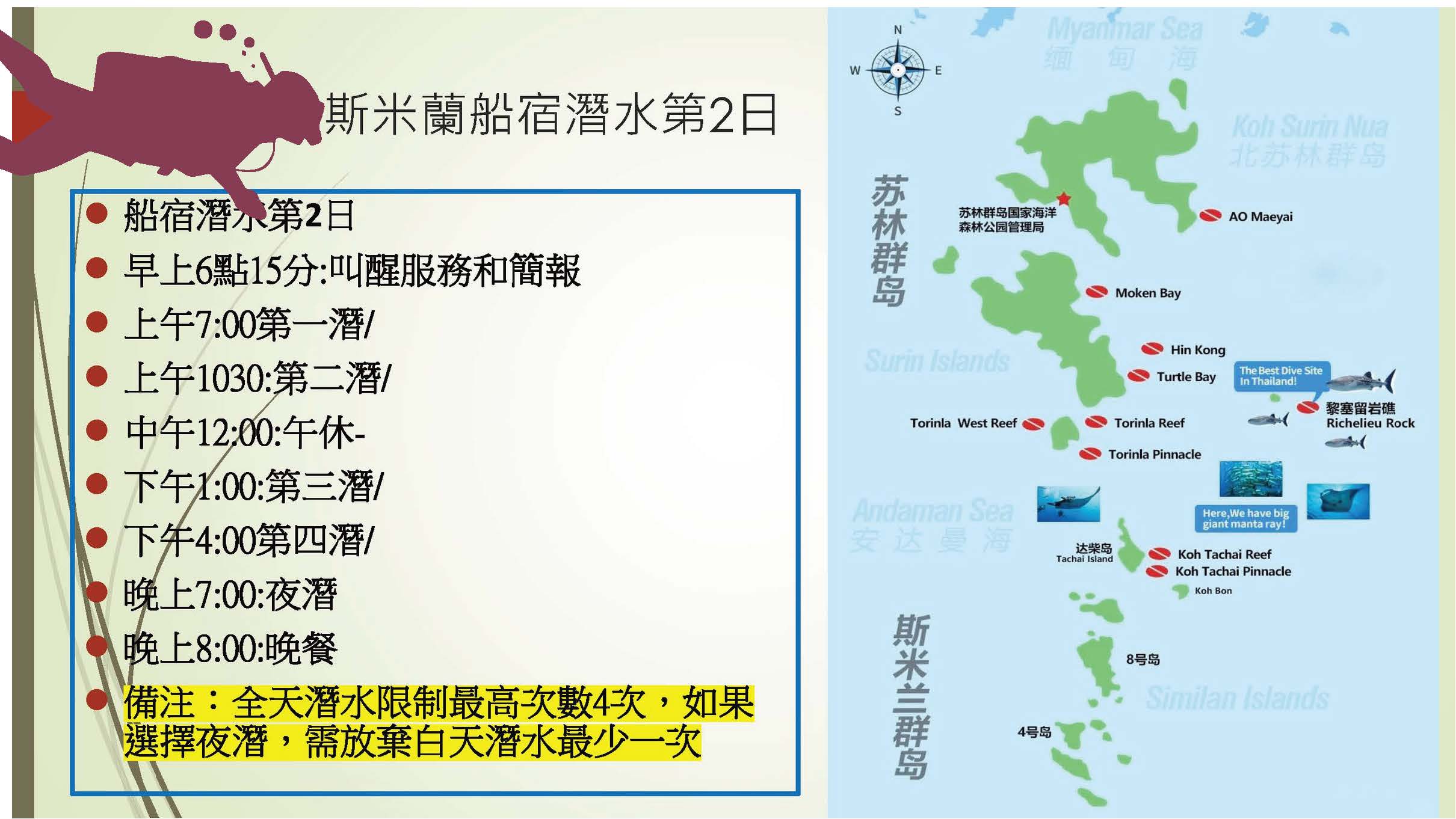 6.潛點安排會視當地天候、交通、等不可抗拒之因素更動順序,皆會在旅遊期間內完成,本公司保有調整之權利。若自行決定不參與以包含潛水項目則不另退費。