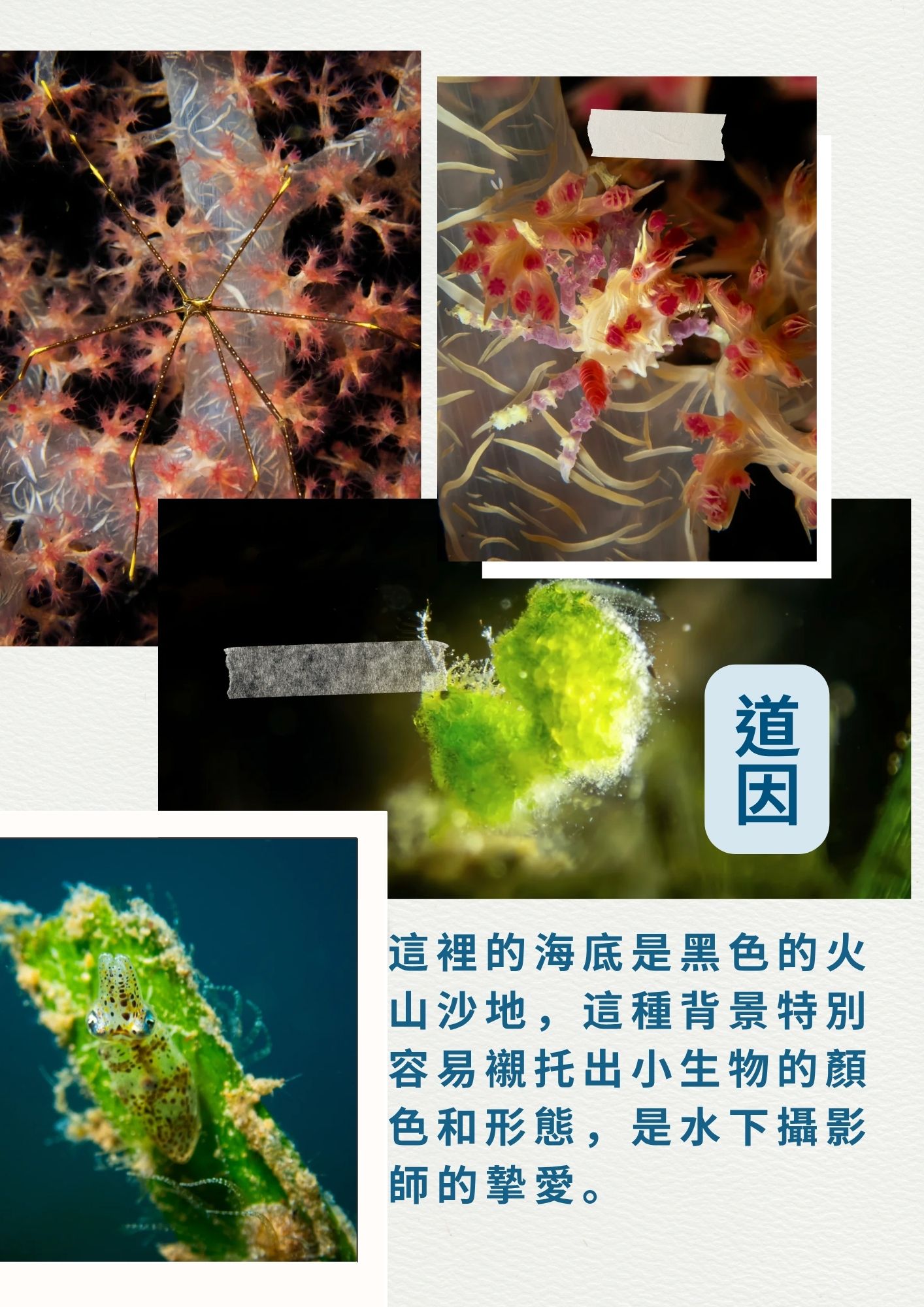 有著鮮豔色彩的然硬珊瑚,還有多樣性生物很適合夜潛~如:海馬、鬼龍、葉魚、蛇鰻、小烏賊、魔鬼魚、娃娃魚、管魚…等等,喜歡找尋驚喜的潛友不可錯過的潛點!