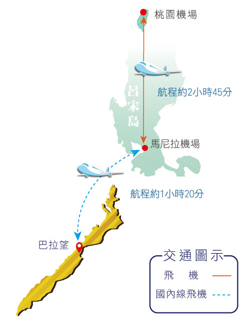 自行於桃園機場搭乘班機飛抵菲律賓馬尼拉國際機場,抵達後轉機飛往公主港國際機場。機場集合由車輛接駁至碼頭登船出發。 ※如有需協助訂購機票,歡迎來電洽詢。 |