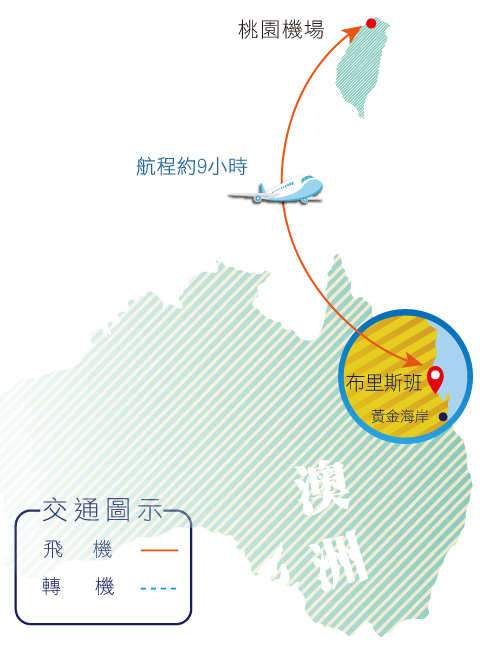 今日搭乘豪華客機飛往前往昆士蘭省首府布里斯班。本日因長途飛行將於夜宿機上,班機於隔日上午抵達澳洲。機上有許多娛樂設施,遊戲機、旅遊頻道、各式音樂以及首映電影等等…,或許您可以有個舒適的睡眠以迎接即將開始的旅程。 |