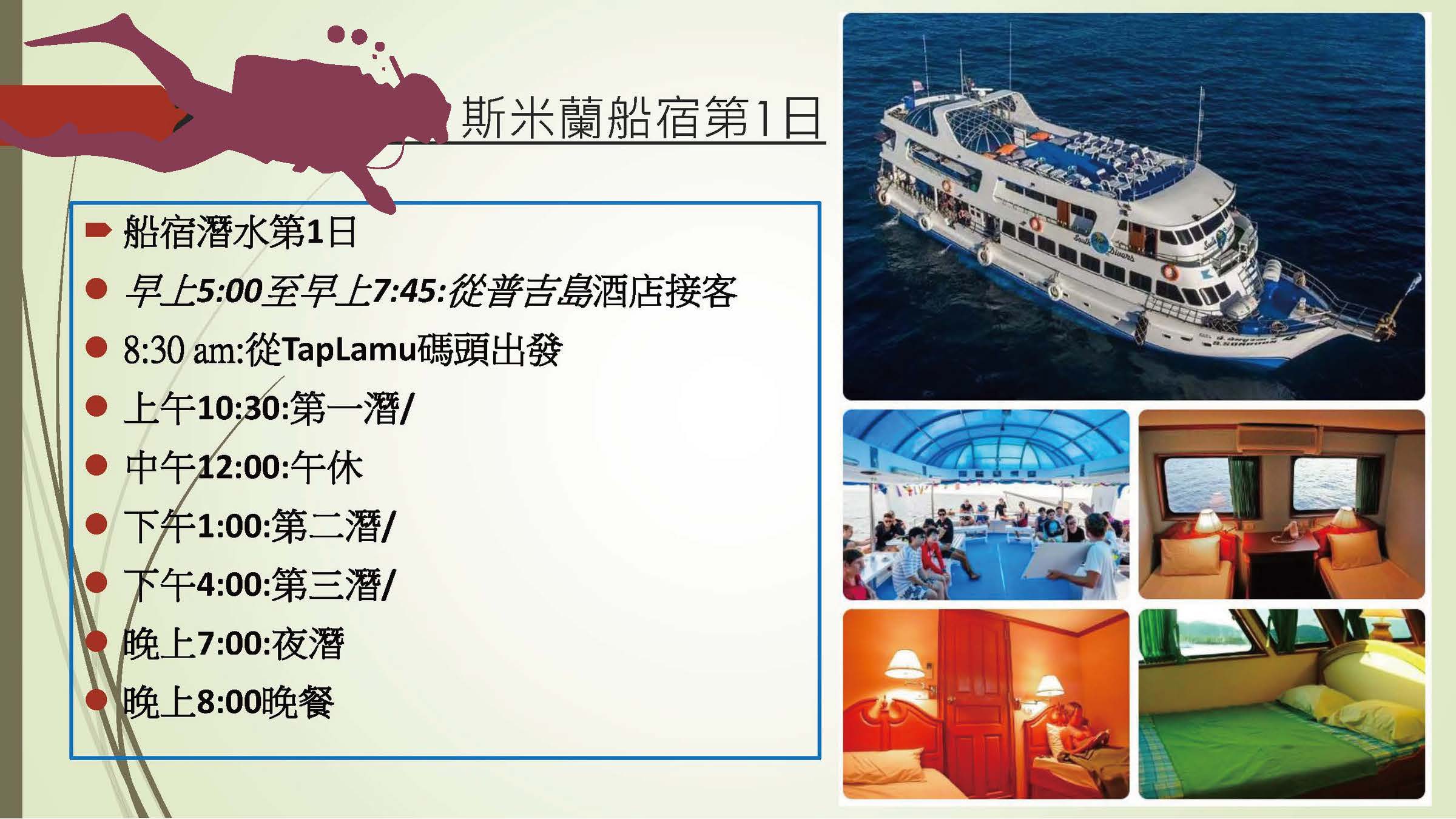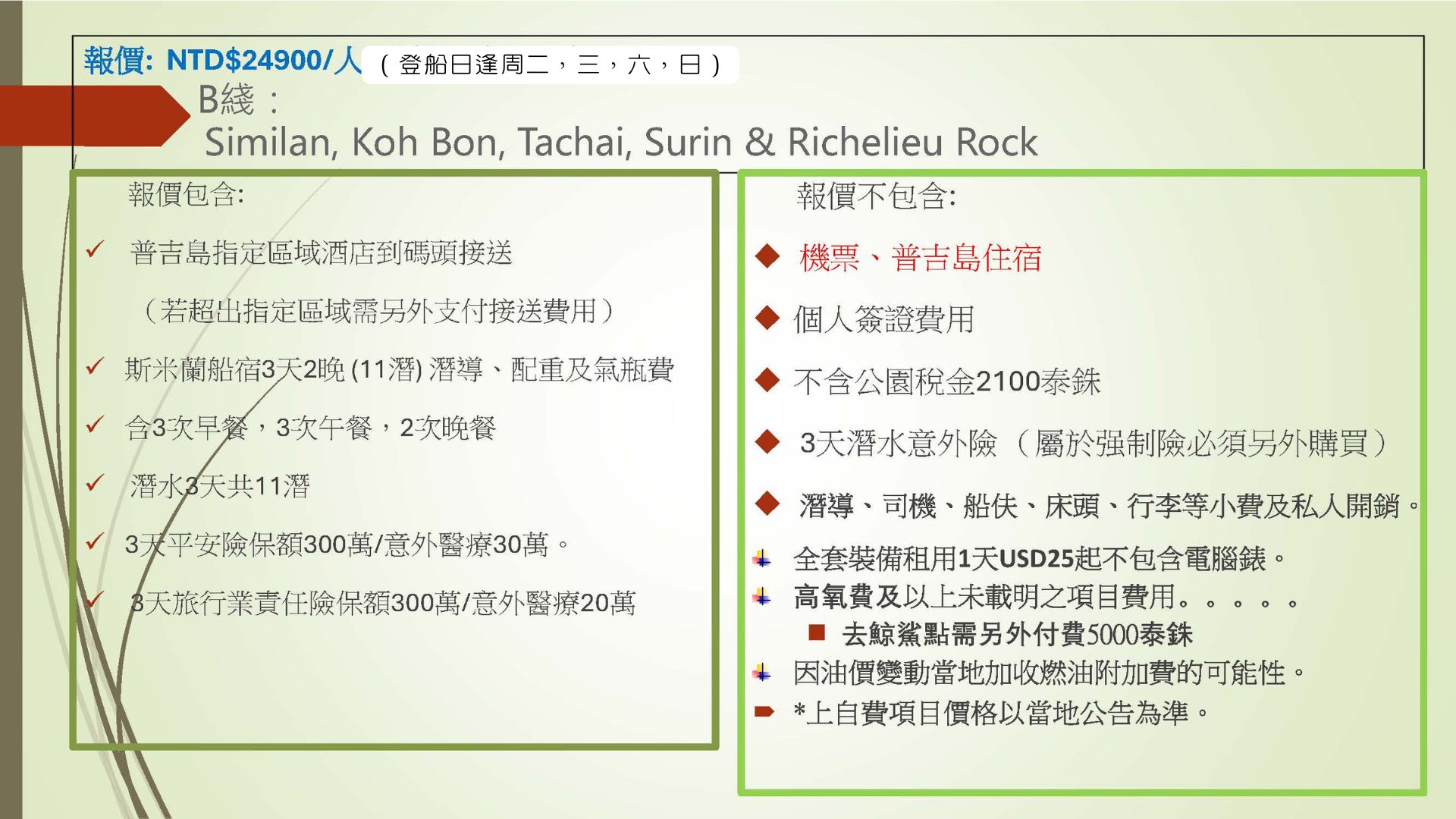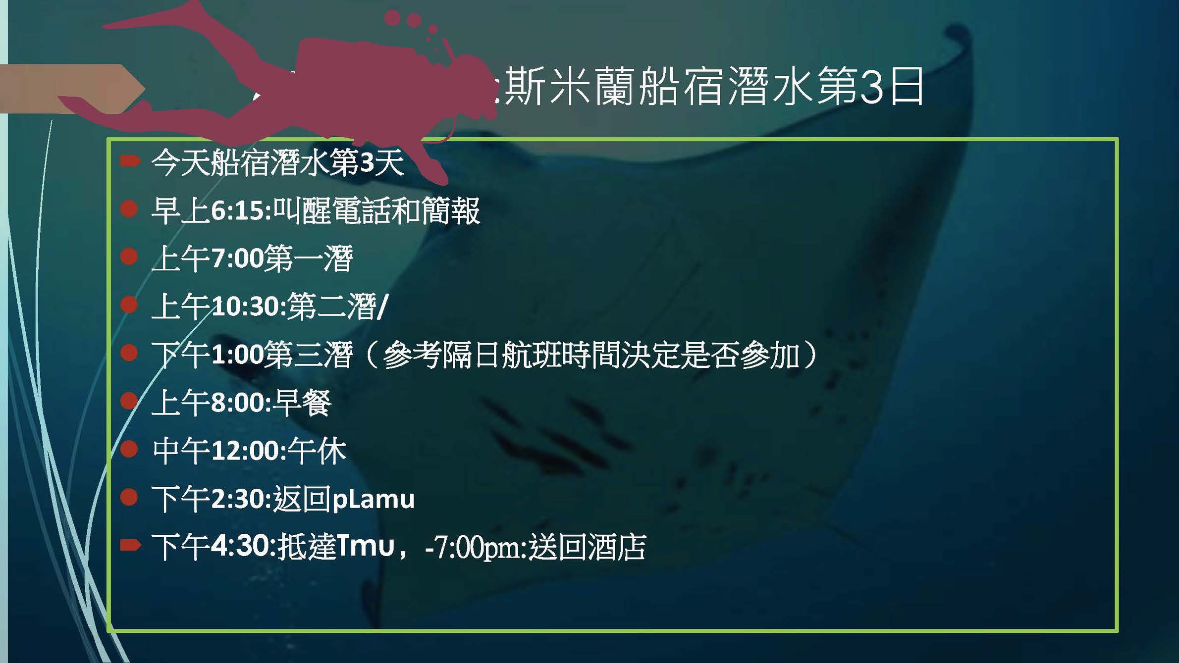 6.潛點安排會視當地天候、交通、等不可抗拒之因素更動順序,皆會在旅遊期間內完成,本公司保有調整之權利。若自行決定不參與以包含潛水項目則不另退費。