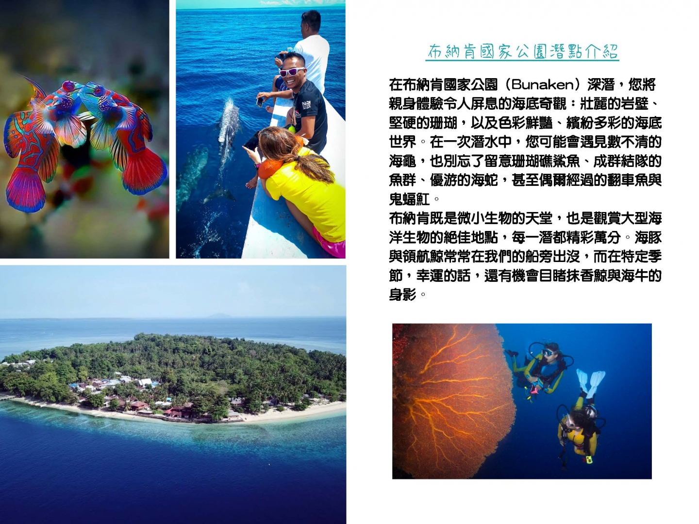 這裡有三座自然生態保護區-西邊的布納肯、北邊的曼卡、東邊的藍碧海峽,海洋生態豐富,擁有西太平洋中70%魚類,珍奇珊瑚覆蓋率高達95%,對熱愛潛水的人而言,簡直就是天堂。